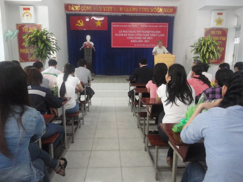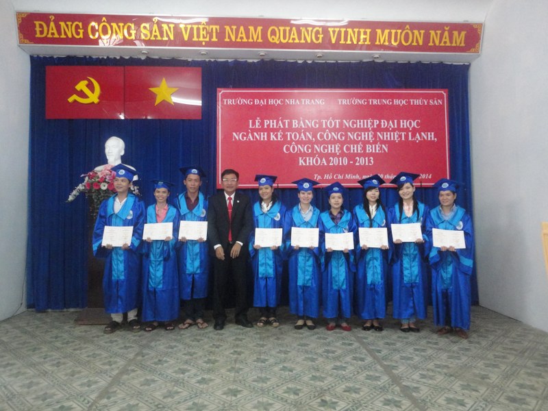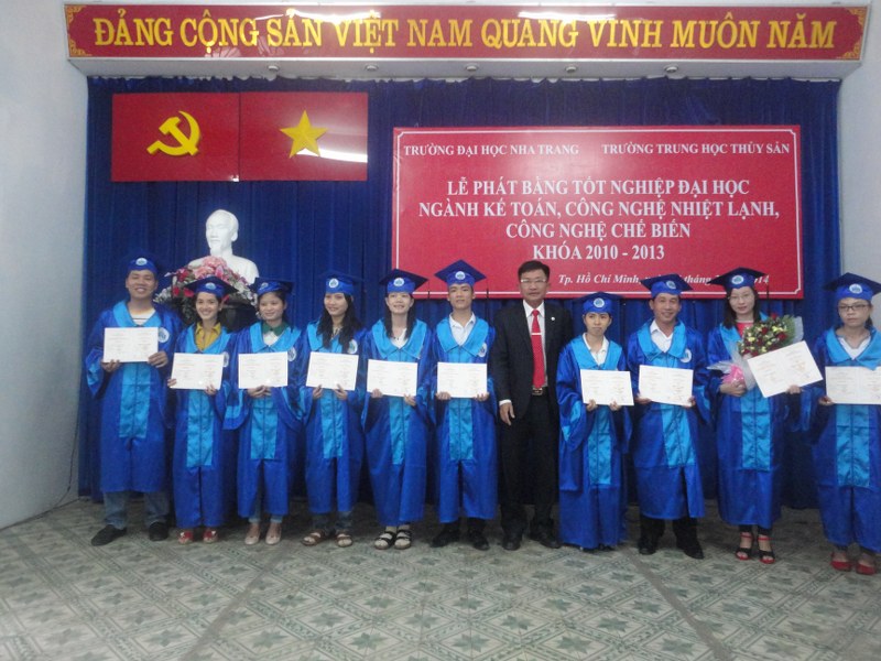 Sáng 30/3/2014, Đại học Nha Trang liên kết cùng Trường Trung học Thủy sản đã long trọng tổ lễ phát bằng Tốt nghiệp các lớp liên thông khóa 10 ngành Kế Toán, Công nghệ Nhiệt lạnh, Công nghệ Chế biến với sự tham gia của các tân kỹ sư, cử nhân, quý vị phụ huynh cùng bạn bè đã đến chúc mừng.