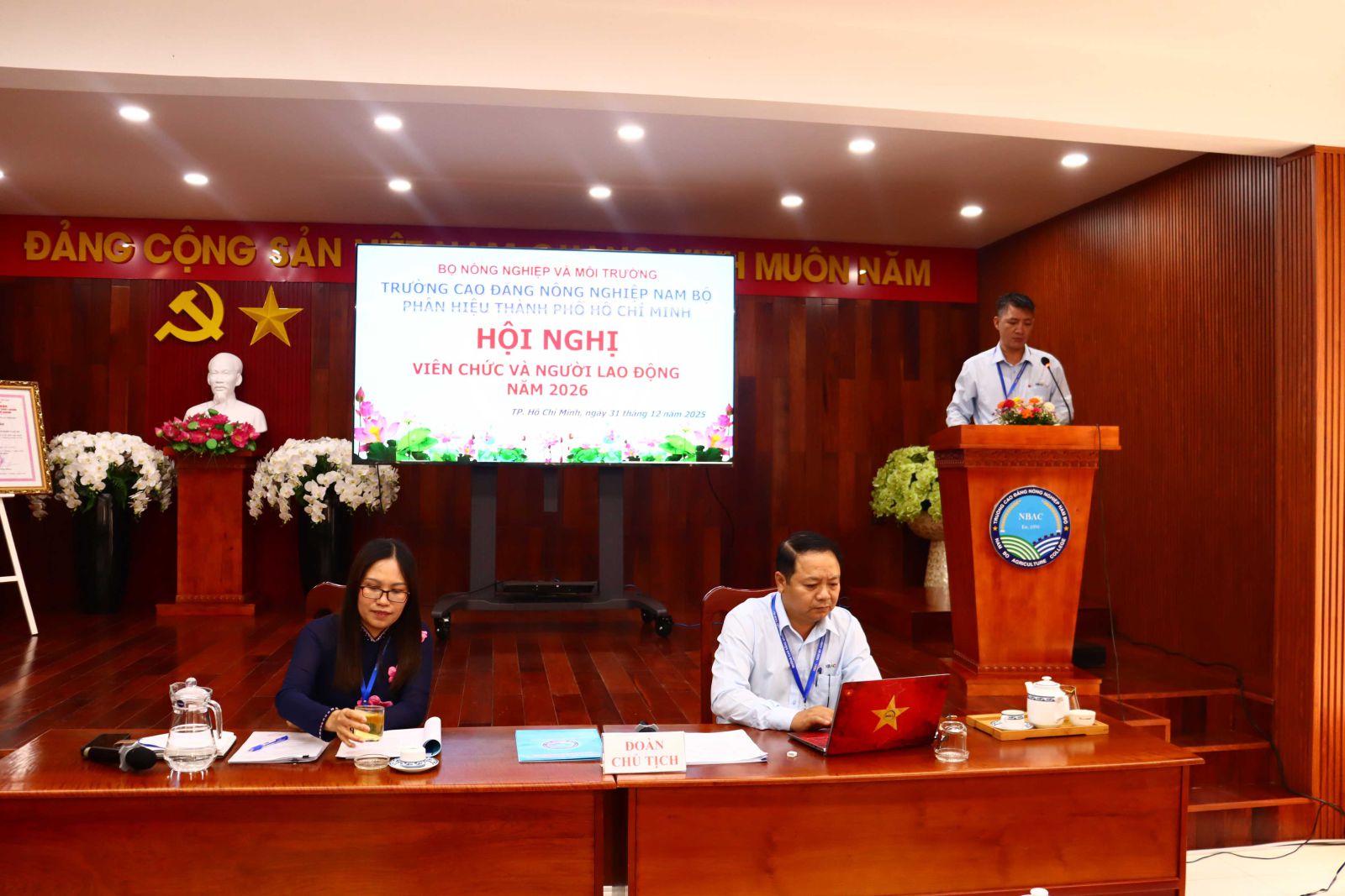 Ngày 31 tháng 12 năm 2025, Phân hiệu trường Cao đẳng Nông nghiệp Nam Bộ tại Thành phố Hồ Chí Minh đã tổ chức Hội nghị viên chức và người lao động năm 2026. Hội nghị thông qua báo cáo tổng kết năm 2025 và phương hướng nhiệm vụ năm 2026, báo cáo tài chính, báo cáo hoạt động của Ban thanh tra nhân dân. Hội nghị cũng đã góp ý, thảo luận một số quy chế của Phân hiệu năm 2026.