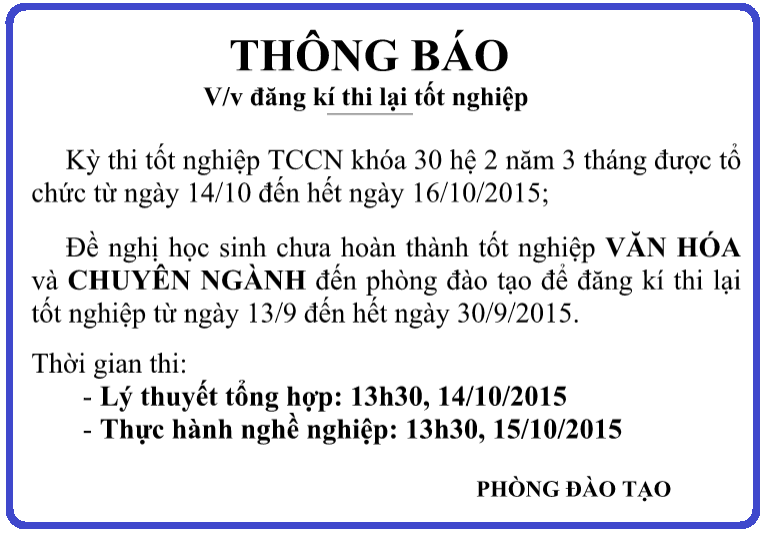 Đề nghị học sinh chưa hoàn thành tốt nghiệp VĂN HÓA và CHUYÊN NGÀNH đến phòng đào tạo để đăng kí thi lại tốt nghiệp từ ngày 13/9 đến hết ngày 30/9/2015.