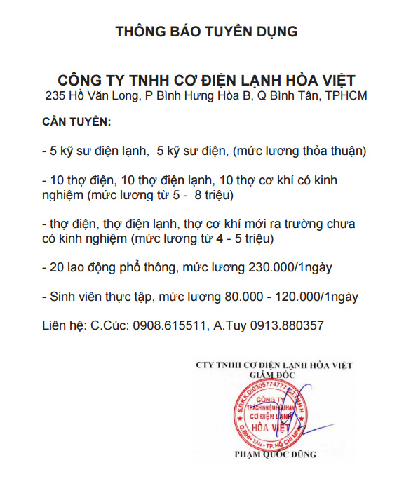 Công Ty TNHH Cơ Điện Lạnh Hòa Việt tuyển dụng nhân viên, kỹ thuật viên