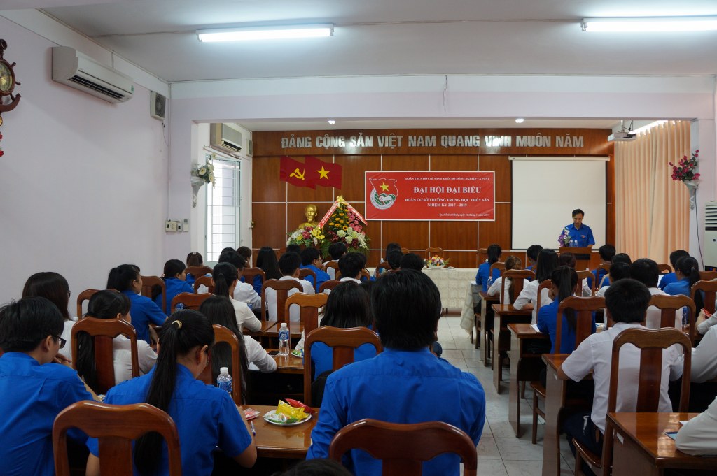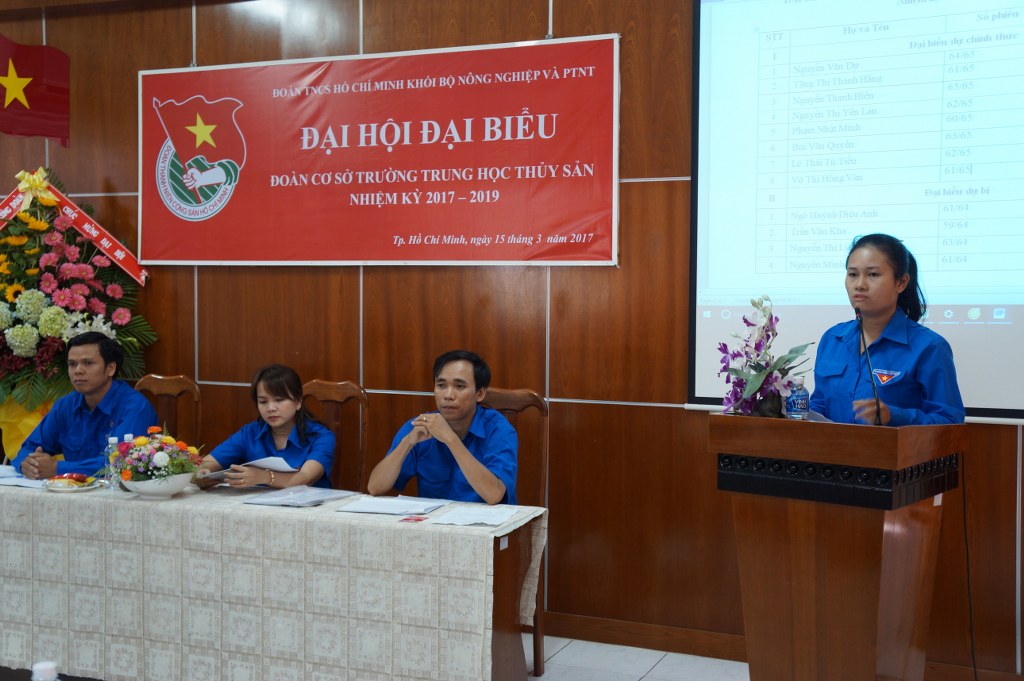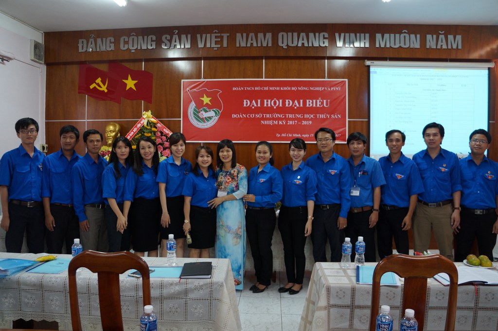 Chào mừng kỷ niệm 86 năm Ngày thành lập Đoàn TNCS Hồ Chí Minh và chào mừng Đại hội Đoàn các cấp, ngày 15/3/2017 Đoàn Trường Trung học Thủy sản long trọng tổ chức Đại hội Đoàn nhiệm kỳ 2017 - 2019, với mục đích tổng kết công tác nhiệm kỳ 2014 - 2017 và đề ra phương hướng nhiệm vụ trong nhiệm kỳ 2017 - 2019. Về tham dự đại có Đồng chí Phan Thị Tuyết Trinh, Phó bí thư Đoàn khối bộ Nông nghiệp và Phát triển nông thôn, Đồng chí Trần Thị Thu Bình, chi ủy viên, Phó hiệu trưởng Nhà trường cùng 65 bạn Đoàn viên thanh niên trường.