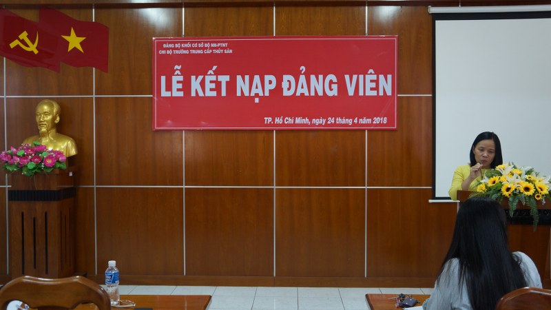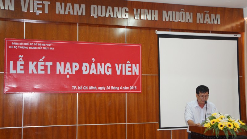 Chiều ngày 24/04/2018 Chi bộ Trường Trung cấp Thủy sản đã tổ chức kết nạp cho quần chúng Đỗ Đậu Thi Thơ – Chuyên viên phòng Tài chính - Kế toán vào Đảng Cộng sản Việt Nam. Tham dự buổi lễ có đồng chí Nguyễn Trọng Ánh Tuyết – Bí thư Chi bộ, Quyền Hiệu Trưởng nhà Trường; đồng chí Ma Kiên Ích, Phó Bí thư Chi bộ và toàn thể đảng viên trong Chi bộ Trường Trung cấp Thủy sản. Lễ kết nạp đảng viên mới được tổ chức trang nghiêm, đúng trình tự, quy trình theo Hướng dẫn 01-HD/TW về một số vấn đề cụ thể thi hành Điều lệ Đảng.