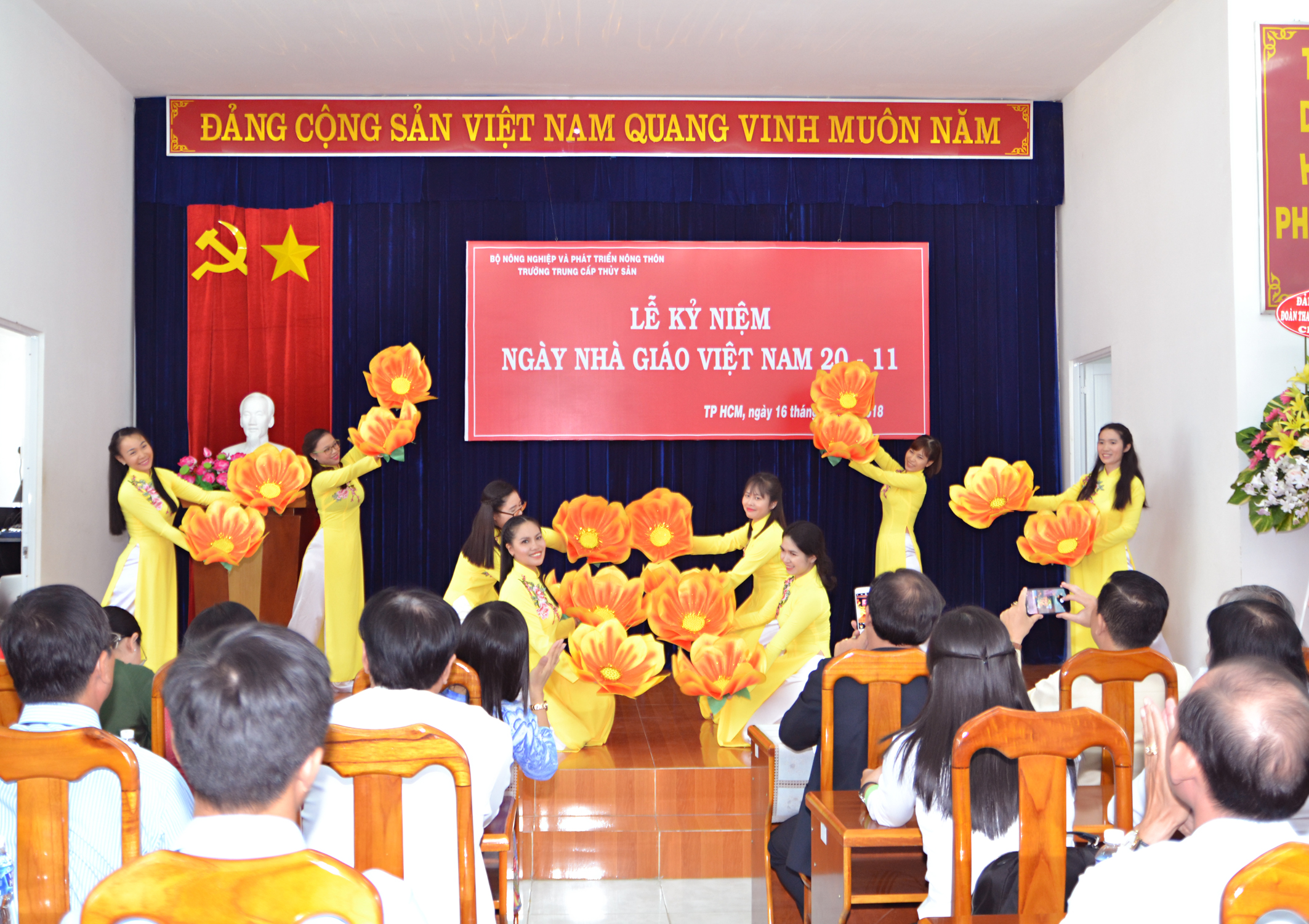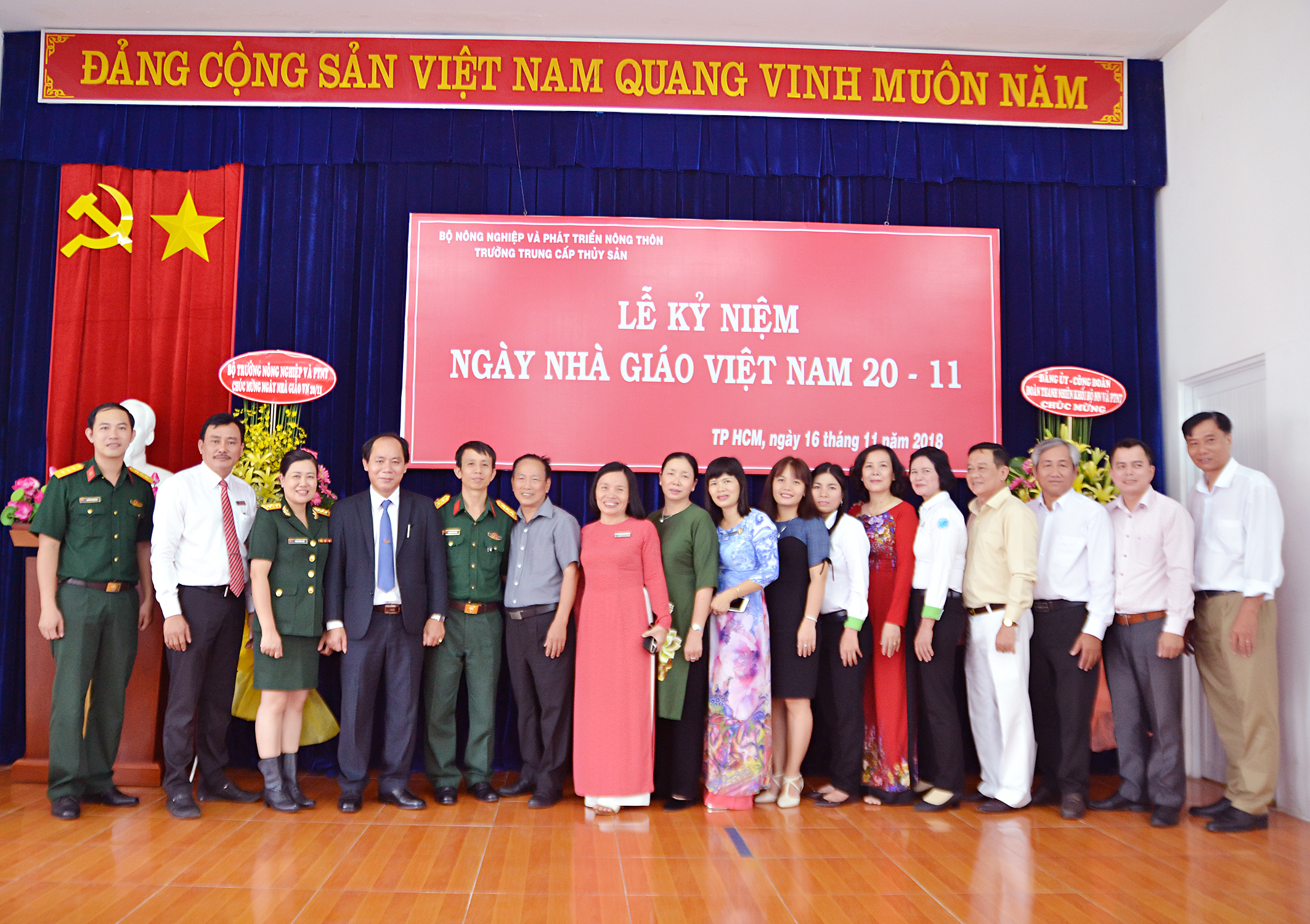 Hòa trong không khí tưng bừng của cả nước chào mừng Lễ kỷ niệm Hiến chương Nhà giáo Việt Nam, sáng ngày 16/11/2018 Trường Trung cấp Thủy sản long trọng tổ chức Lể kỷ niệm Ngày Nhà giáo Việt Nam 20/11. Đến tham dự buổi lễ có sự tham dự của Đồng chí Lê Viết Bình Phó Chánh VP Bộ NN và PTNT, Trưởng đại diện VP Bộ tại TPHCM; Đồng chí Lý Mộng Xuân, Ủy viên ban thường vụ Đảng ủy khối, Đồng chí Biện Văn Sáu, ủy viên BCH Công đoàn NN và PTNT VN cùng toàn thể cán bộ, giáo viên, công nhân viên và học sinh Trường tham dự.