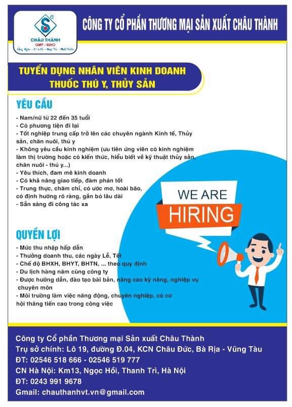 - Có ít nhất 1 năm kinh nghiệm làm thị trường thú y , thuốc thủy sản.
