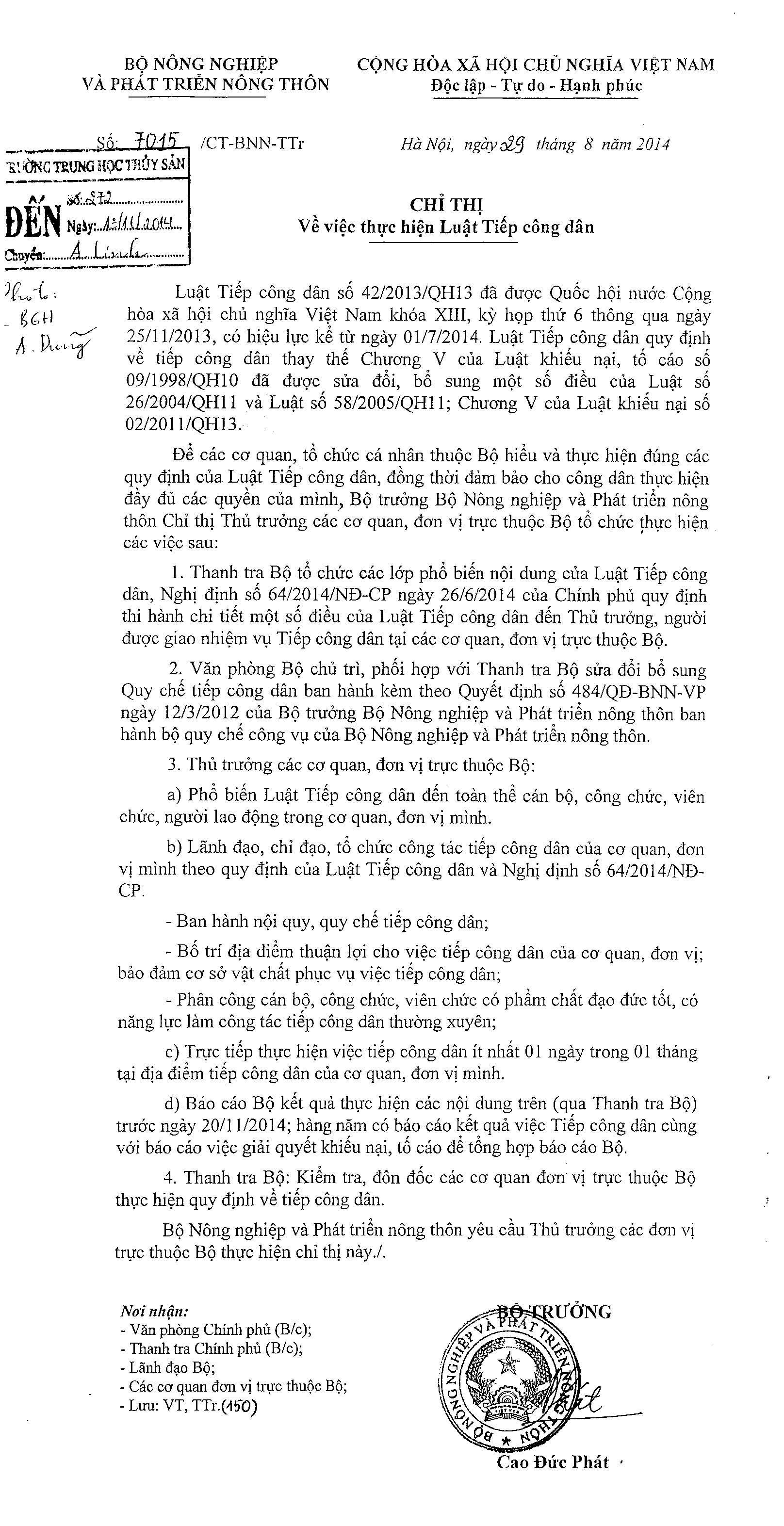 Để các cơ quan, tổ chức cá nhân thuộc Bộ hiểu và thực hiện đúng các quy định của Luật Tiếp công dân, đồng thời đảm bảo cho công dân thực hiện đầy đủ các quyền của mình, Bộ trưởng Bộ Nông nghiệp và Phát triển nông thôn đã ban hành Chỉ thị 7015 ngày 29/8/2014 về việc thực hiện Luật tiếp công dân. (Luật Tiếp công dân số 42/2013/QH13 và Nghị định 64/2014/NĐ-CP)