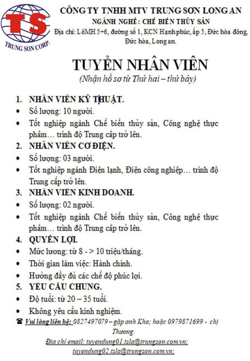 Công ty TNHH Một thành viên Trung Sơn Long An thông báo tuyển dụng Chuyên về lĩnh vực chế biến thuỷ sản, công ty đang có nhu cầu tuyển dụng: 10 nhân viên kỹ thuật ngành Chế biến thuỷ sản, 03 nhân viên Cơ điện lạnh và 02 nhân viên kinh doanh…
