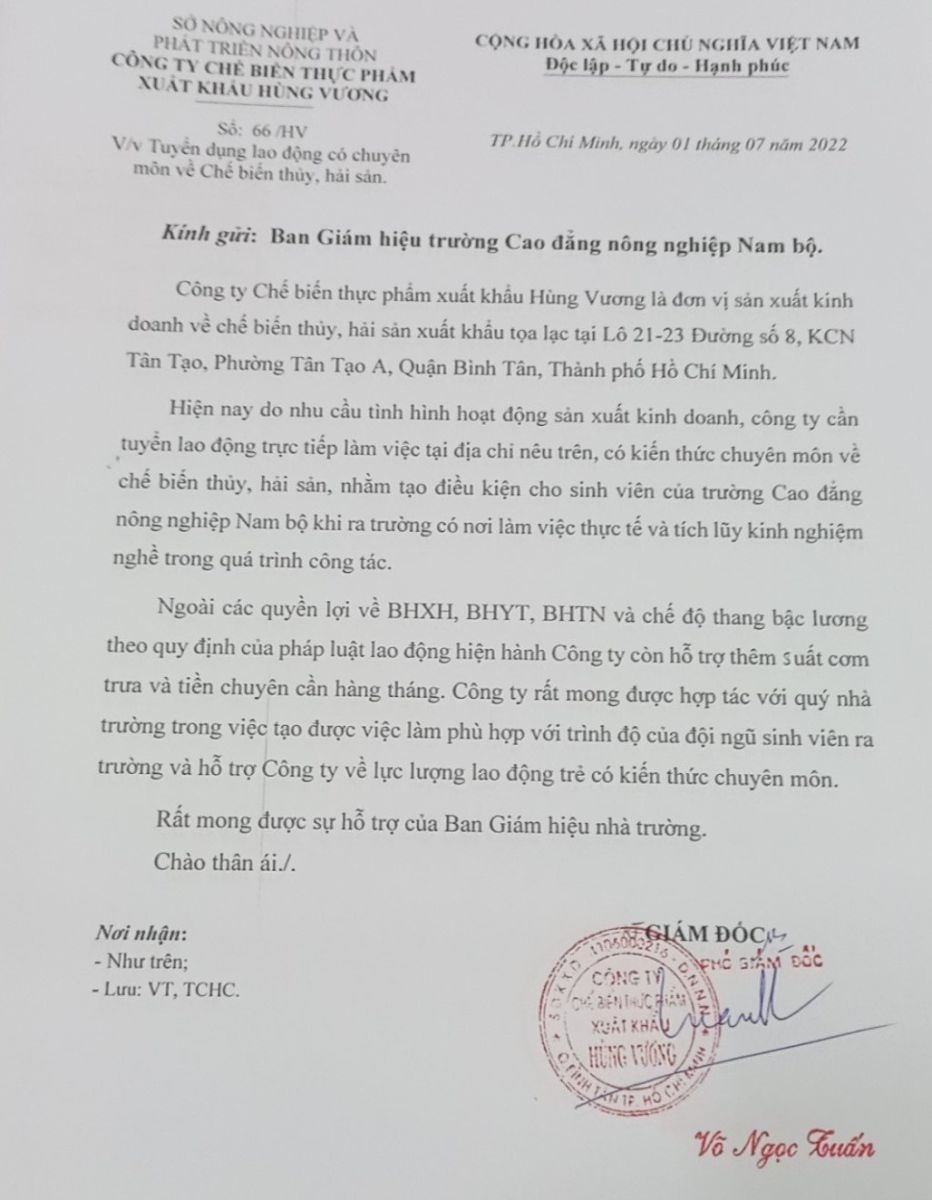 Công ty chế biến thực phẩm xuất khẩu Hùng Vương tuyển dụng nhân viên ngành chế biến thực phẩm, thủy sản với nhiều chế độ về BHXH, BHYT, BHTN và chế độ thang bậc lương theo quy định của pháp luật.