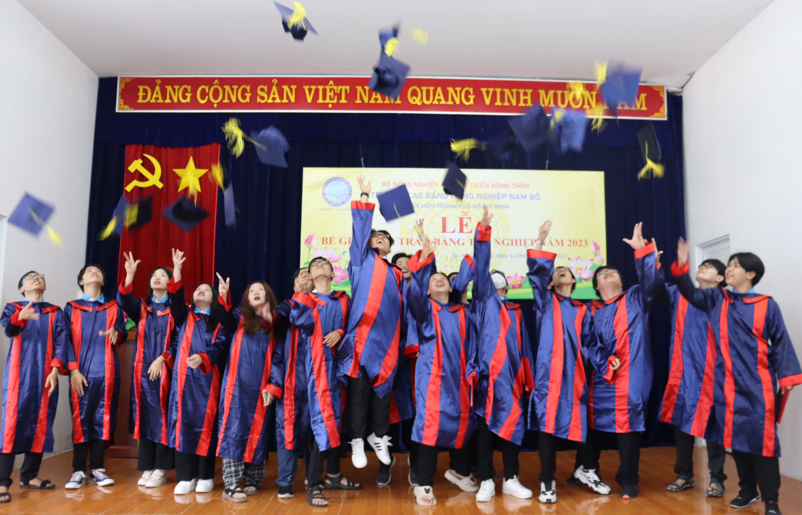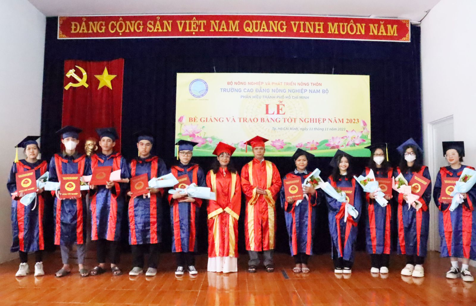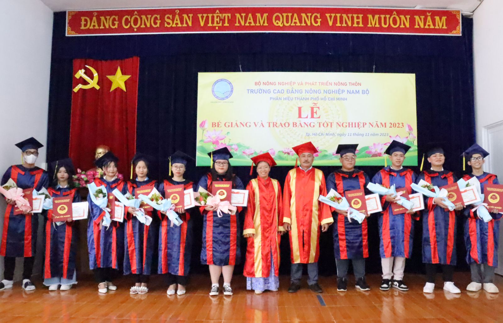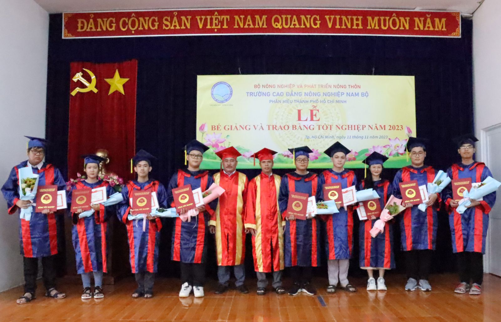 Sáng ngày 11/11/2023, Phân hiệu của Trường cao đẳng Nông nghiệp Nam Bộ tại Thành phố Hồ Chí Minh đã long trọng tổ chức Lễ bế giảng và trao bằng tốt nghiệp năm 2023 cho sinh viên tốt nghiệp cao đẳng liên thông khóa 03 và học viên tốt nghiệp Trung cấp khóa 38.