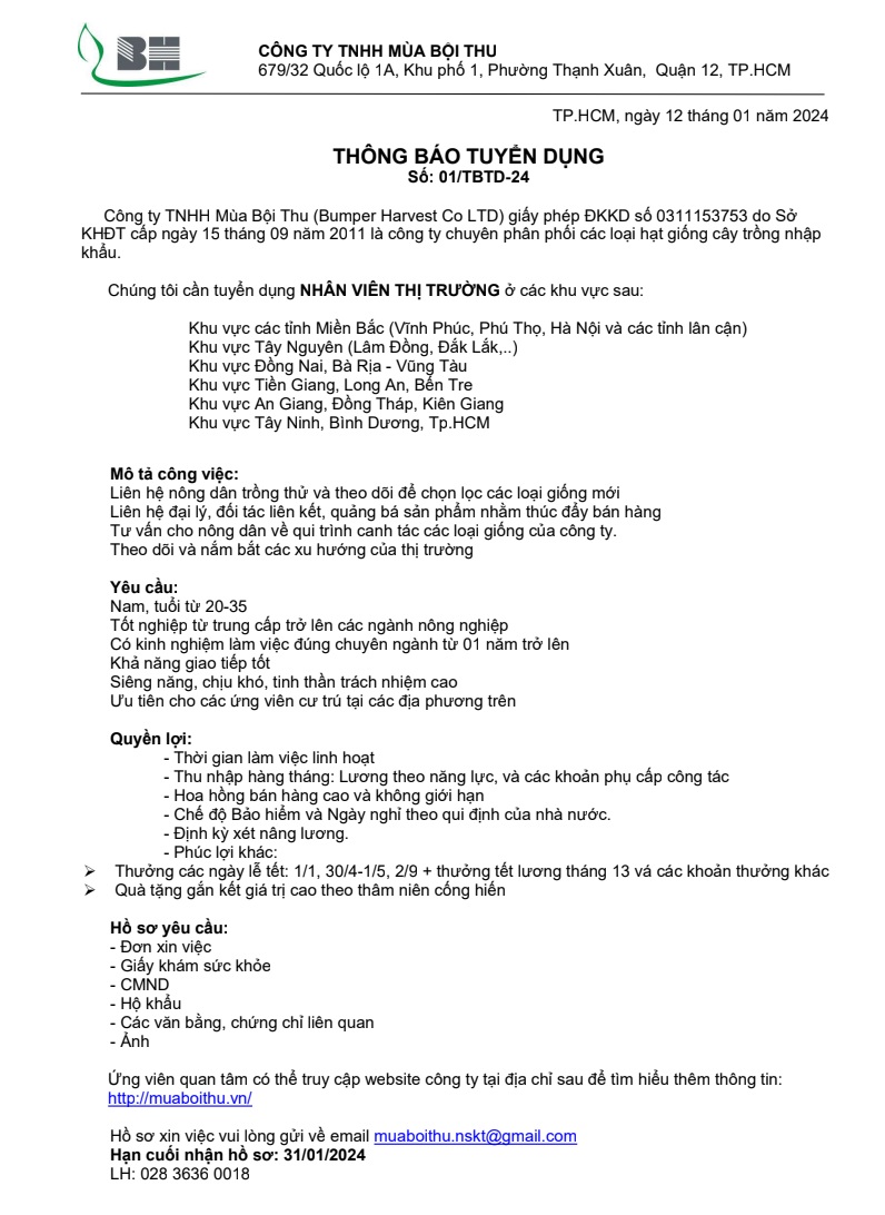 Công ty TNHH Mùa Bội Thu (Bumper Harvest Co LTD) giấy phép ĐKKD số 0311153753 do Sở KHĐT cấp ngày 15 tháng 09 năm 2011 là công ty chuyên phân phối các loại hạt giống cây trồng nhập khẩu. Chúng tôi cần tuyển dụng NHÂN VIÊN THỊ TRƯỜNG ở các khu vực trong cả nước. Chi tiết xem thông báo đính kèm bên dưới: