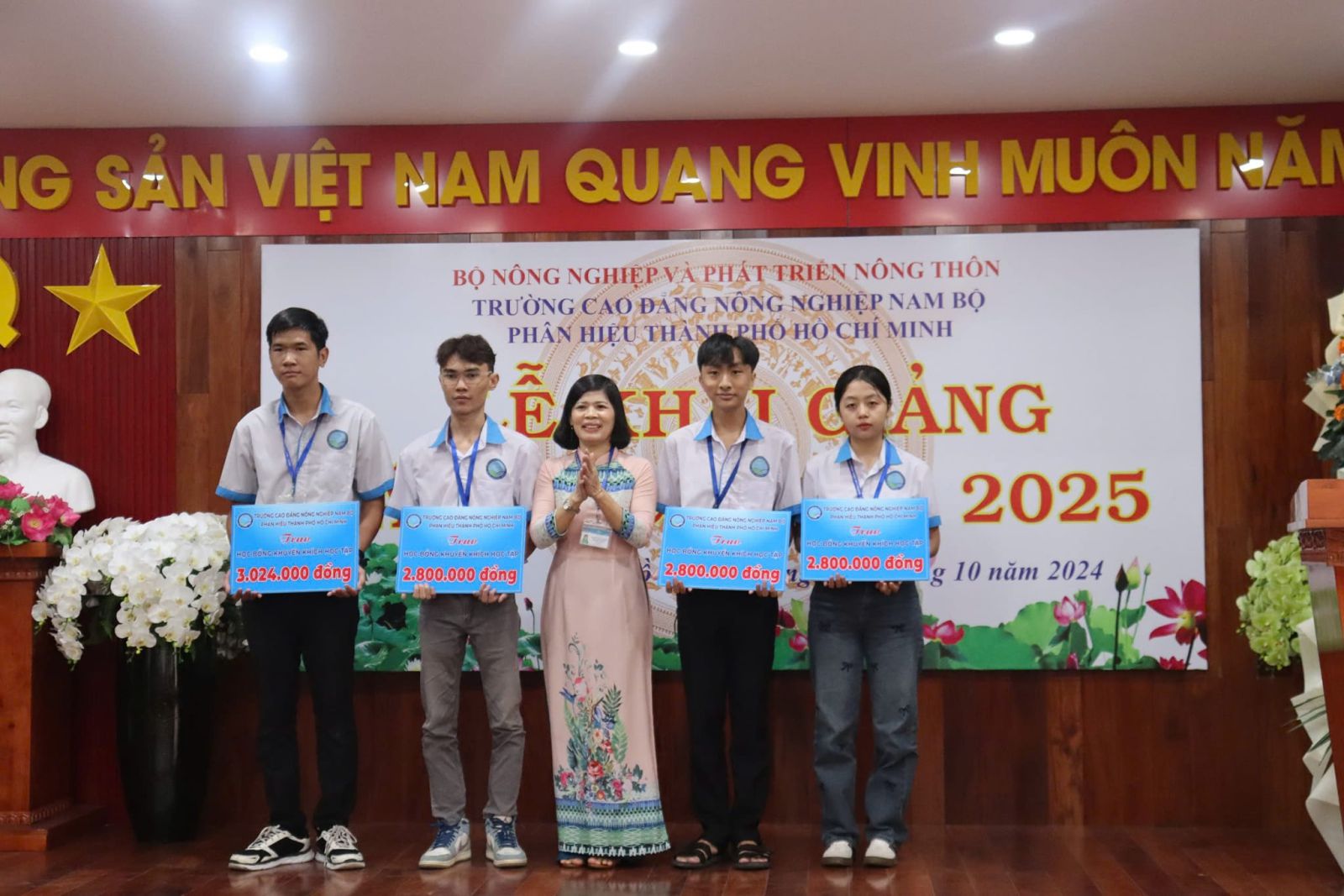 Ngày 11/10/2024, Phân hiệu Trường Cao đẳng Nông nghiệp Nam Bộ tại Thành phố Hồ Chí Minh đã diễn ra Lễ Khai giảng năm học 2024 - 2025. Bên cạnh niềm vui chào đón năm học mới, Nhà trường cũng ghi nhận những kết quả học tập đáng khích lệ của các em học sinh, sinh viên bằng những suất học bổng cho những cá nhân đạt thành tích tốt trong năm học 2023-2024.