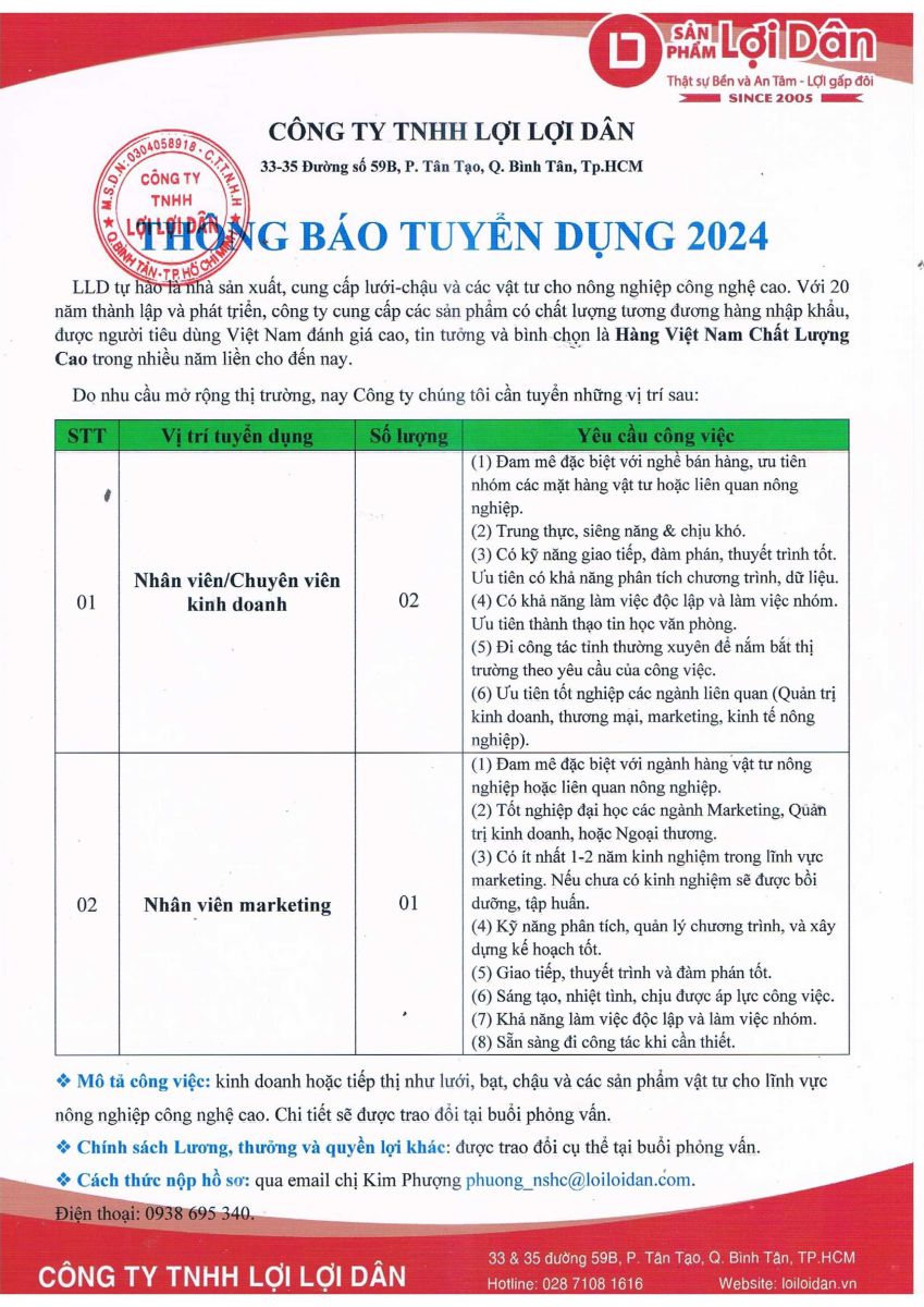 Công ty TNHH Lợi Lợi Dân được thành lập năm 2005, đã kế thừa từ cha ông về nghề dệt, ngành nhựa trước 1975. Tự tin là nhà sản xuất kinh doanh thương mại đa dạng sản phẩm vật tư nông nghiệp ở phân khúc chuẩn và trên. Vì nền nông nghiệp An Ấm Đẹp Giàu, Sản phẩm Lợi Dân đồng hành cùng trang trại, lắng nghe nhà vườn, thấu hiểu người dùng để tạo ra nông sản Việt có thương hiệu và uy tín. Sử dụng Lưới Chậu Khay Sàn Bạt Dây nhựa Lợi Lợi Dân là lợi gấp đôi.