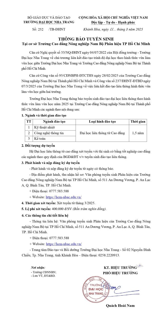 Trường Cao đẳng Nông nghiệp Nam Bộ - Phân hiệu tại Thành phố Hồ Chí Minh thông báo tuyển sinh liên thông Đại học từ Cao đẳng, thời gian đào tạo 1,5 năm. Gồm các ngành: Công nghệ thông tin, Kế toán, Kỹ thuật nhiệt. Học tại Phân hiệu Trường Cao đẳng Nông nghiệp Nam Bộ tại Thành phố Hồ Chí Minh.