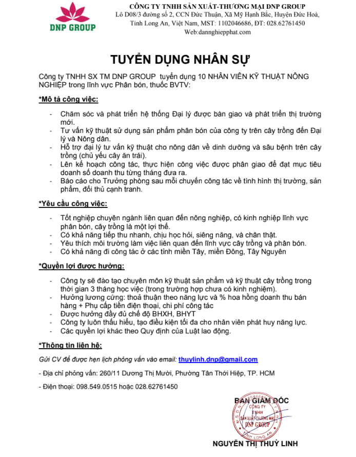 Công ty TNHH SX TM DNP GROUP chuyên hoạt động trong lĩnh vực phân bón và thuốc BVTV. Chúng tôi hiện đang có nhu cầu tuyển dụng 10 nhân viên ở vị trí Kỹ Thuật Nông Nghiệp chuyên về cây ăn trái.