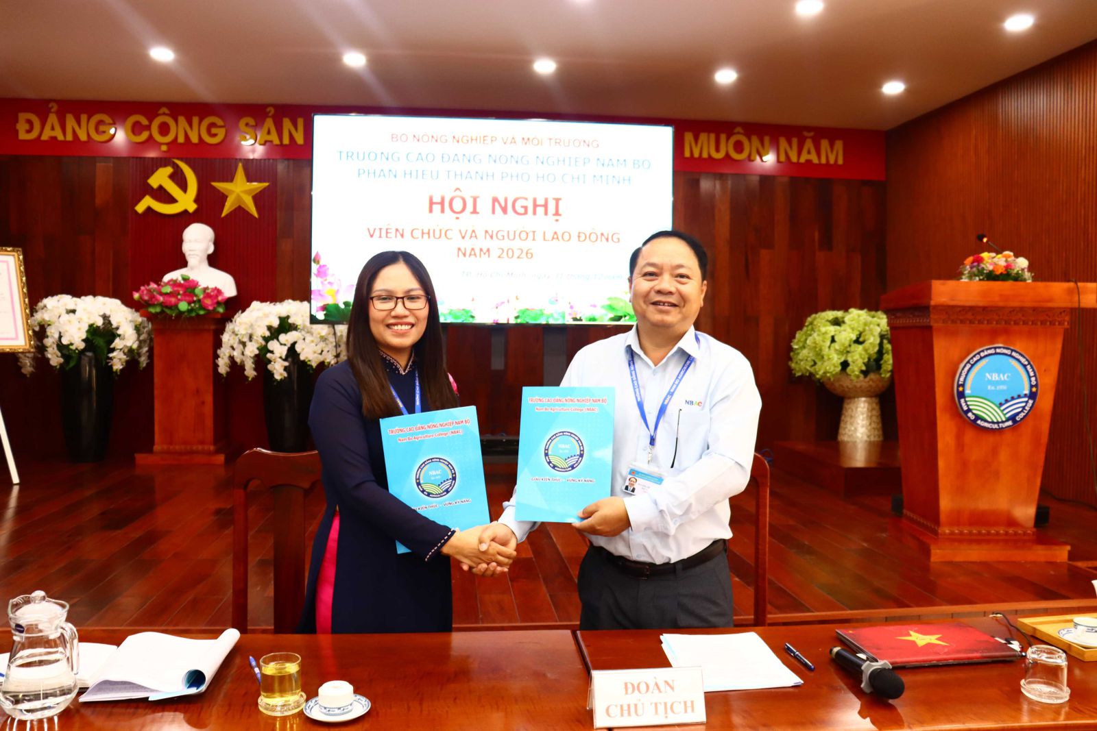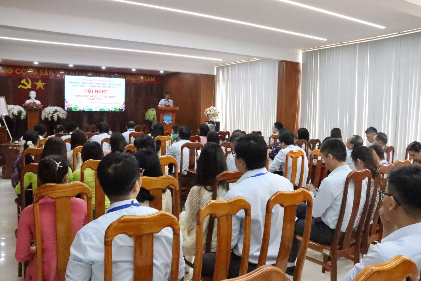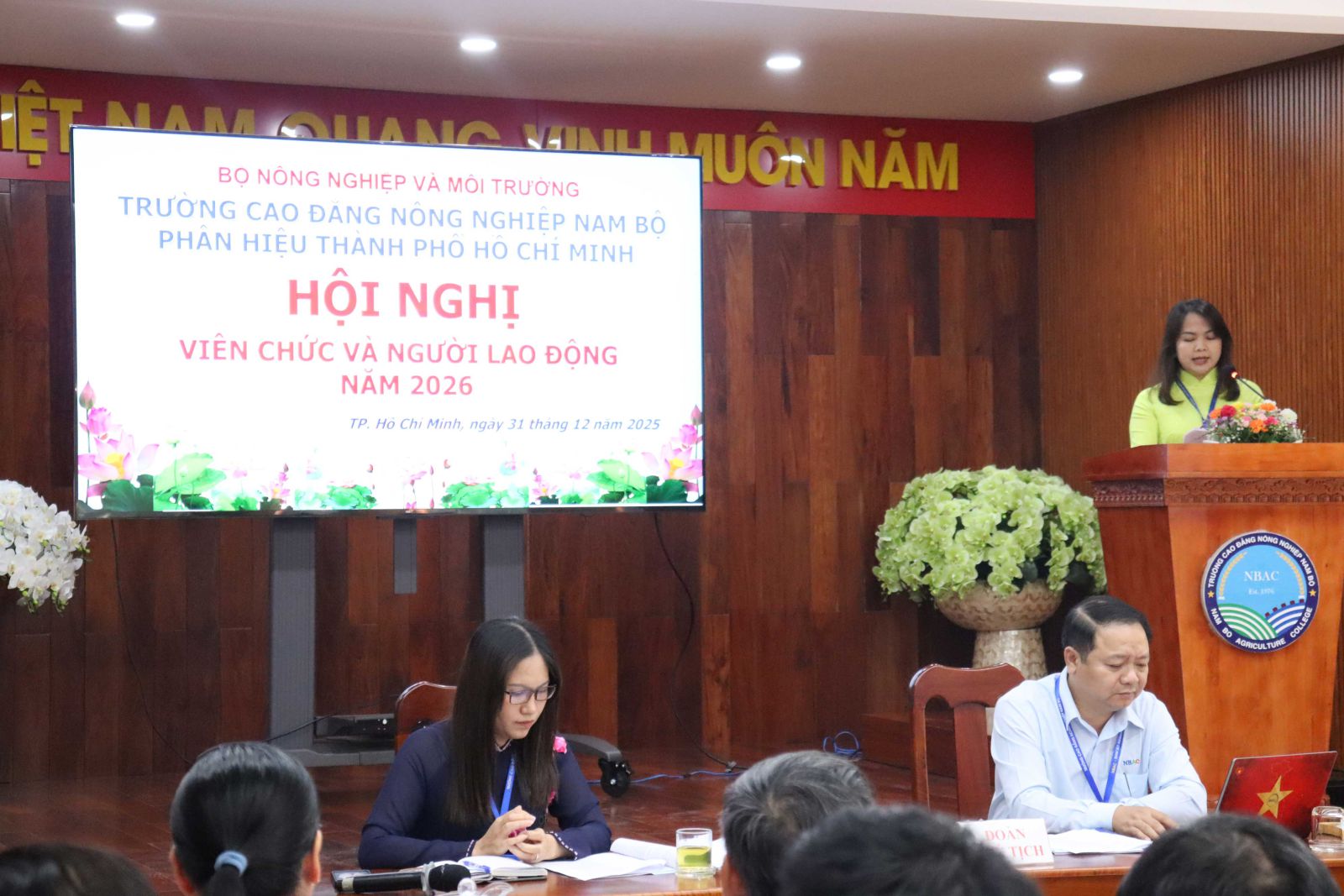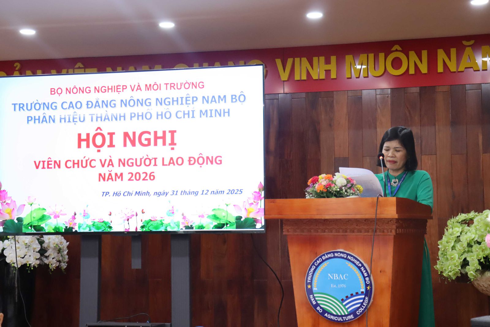 Ngày 31 tháng 12 năm 2025, Phân hiệu trường Cao đẳng Nông nghiệp Nam Bộ tại Thành phố Hồ Chí Minh đã tổ chức Hội nghị viên chức và người lao động năm 2026. Hội nghị thông qua báo cáo tổng kết năm 2025 và phương hướng nhiệm vụ năm 2026, báo cáo tài chính, báo cáo hoạt động của Ban thanh tra nhân dân. Hội nghị cũng đã góp ý, thảo luận một số quy chế của Phân hiệu năm 2026.