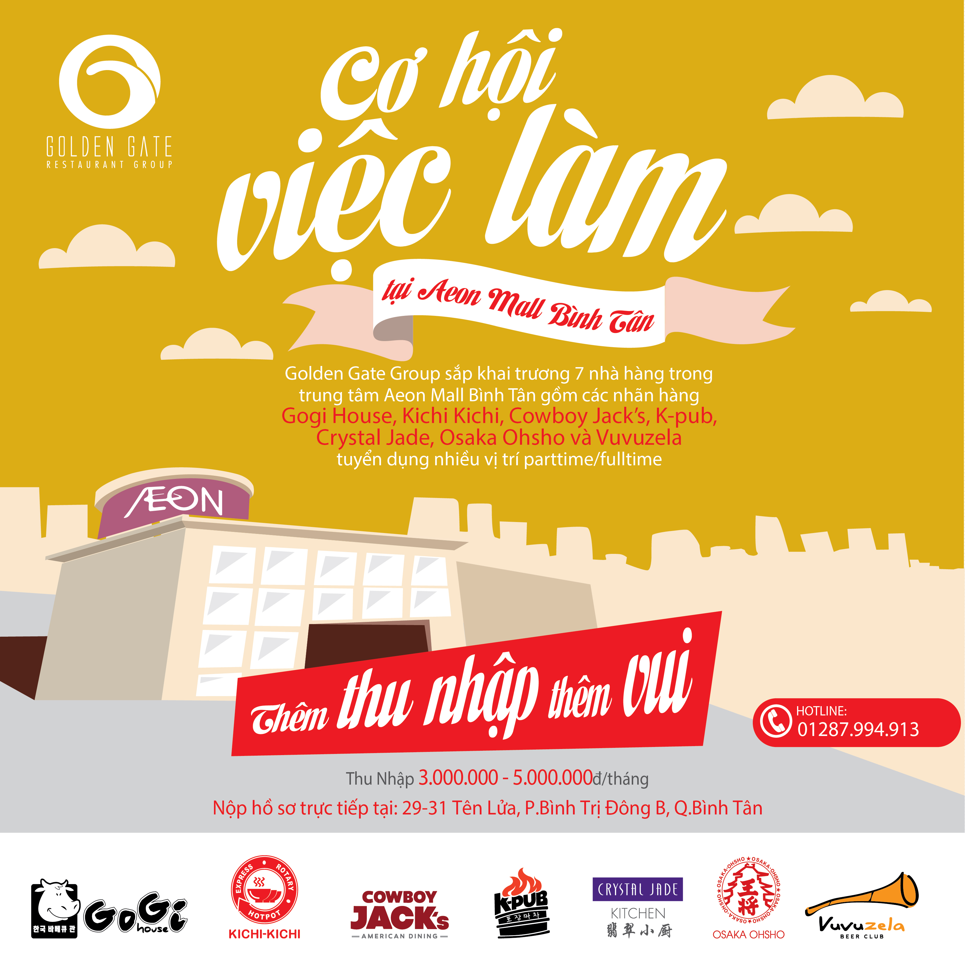 Tập đoàn Golden Gate sắp khai trương chuỗi 7 nhà hàng Gogi House, Kichi Kichi, Cowboy Jack's, K-Pub, Crystal Jade, Osaka Ohsho, Vuvuzela cùng với cơ hội việc làm cực lớn dành cho các bạn gần khu vực quận Bình Tân. Mức lương và các chế độ ưu đãi cực kỳ hấp dẫn Được tham gia các khóa đào tạo miễn phí Hãy gia nhập ngay Golden Gate Group - tập đoàn sở hữu chuỗi nhà hàng lớn nhất Việt Nam