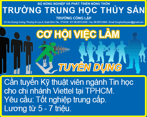 Chi nhánh Viettel Thành phố Hồ Chí Minh cần tuyển 20 nhân viên kỹ thuật làm việc tại các chi nhánh trên địa bàn Thành phố. Yêu cầu: - Nam/nữ tuổi từ 20 - 29; - Tốt nghiệp hệ trung cấp trở lên các ngành: Công nghệ thông tin. Điện tử viễn thông, Điện – Điện tử…; - Có kỹ năng giao tiếp tốt; - Lương + thưởng/ tháng: 4.500.000 VNĐ => 6.000.000 VNĐ